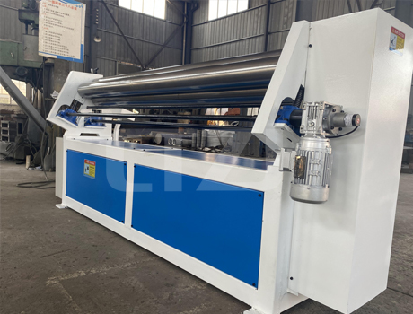該機(jī)結(jié)構(gòu)型式為三輥非對稱式,下輥為主傳動,并做垂直升降運動,以便夾緊板材。通過下輥齒輪與上輥齒輪嚙合,同時作為主傳動,側(cè)輥作傾升降運動。具有預(yù)彎、卷圓多重功能,結(jié)構(gòu)緊湊操作維修方便。